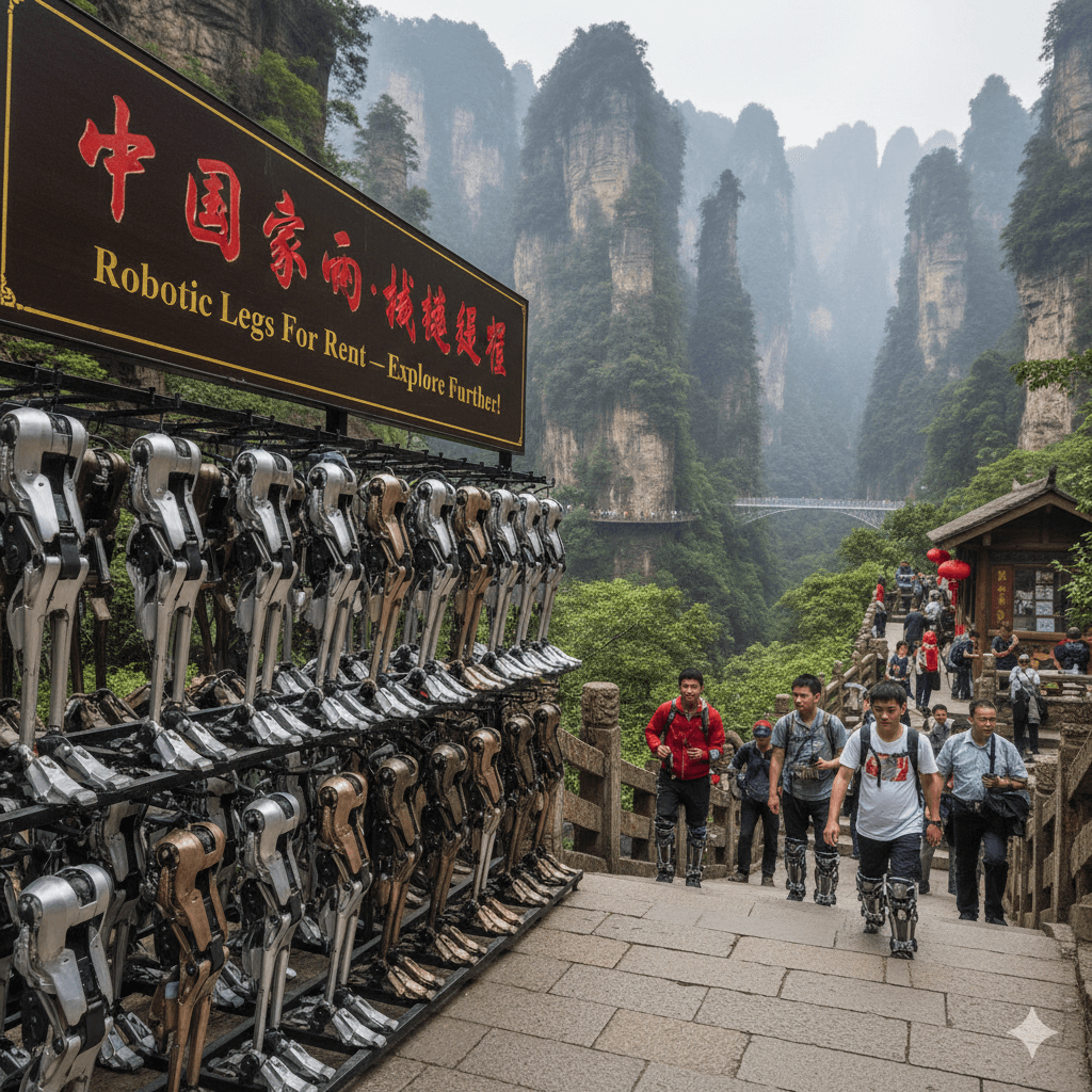 While exploring the iconic Zhangjiajie National Forest Park—famous for its towering sandstone pillars and the inspiration behind the floating mountains in Avatar—the traveler encountered a rental stand offering robotic exoskeleton legs designed to assist hikers. The high-tech gear, which provides mechanical support for walking, climbing, and descending, is revolutionizing how visitors experience the park’s challenging terrain.